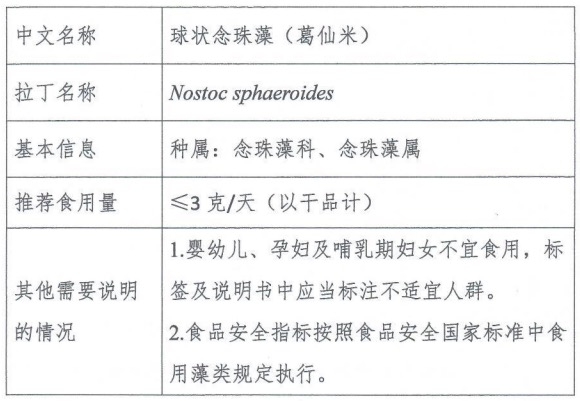 2018年9月12日國家衛(wèi)生健康委員會發(fā)布“關于黑果腺肋花楸果等2種新食品原料的公告 (2018年 第10號)”正式批準球狀念珠藻(葛仙米)為新食品原料。